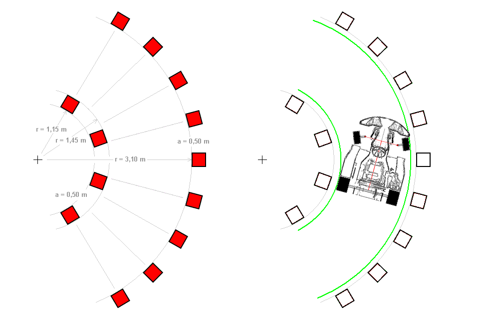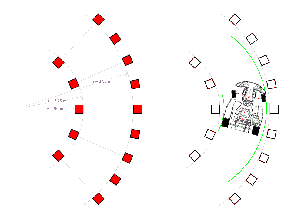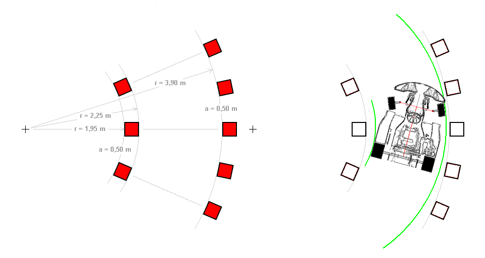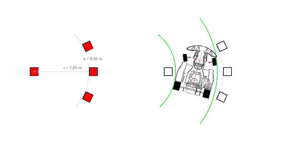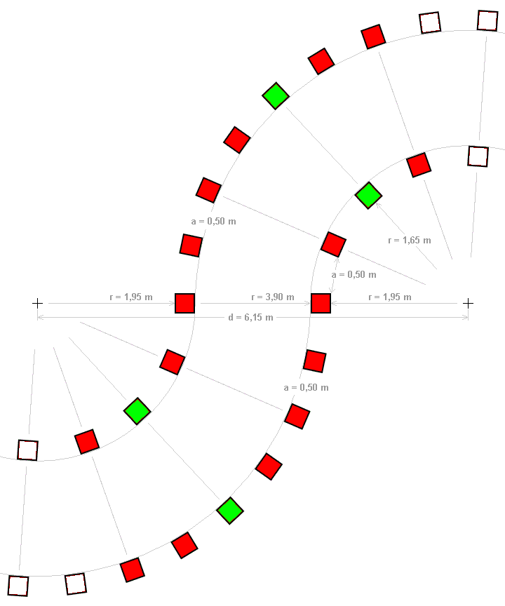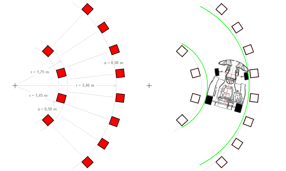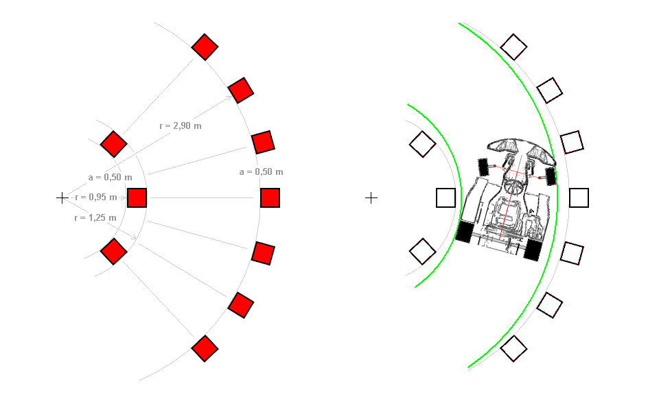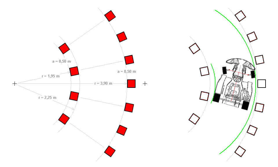 Eine gebogenen Spurgasse ist besonders einfach aufzubauen, wenn bestimmte Festlegungen getroffen werden. Ideal ist, wenn in einem Winkelbereich auf der Außenlinie doppelt so viele Pylonen stehen wie auf der Innenseite. Durch die vorgegebene Fahrspurbreite von 1,65 m zuzüglich 0,30 m für eine Pylone steht die Differenz beider Radien mit 1,95 m fest. Somit muss auch der innere Radius 1,95 m besitzen, damit außen ein doppelt so großer von 3,90 m entsteht.