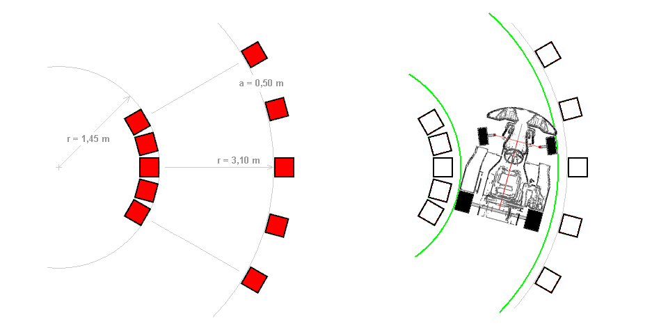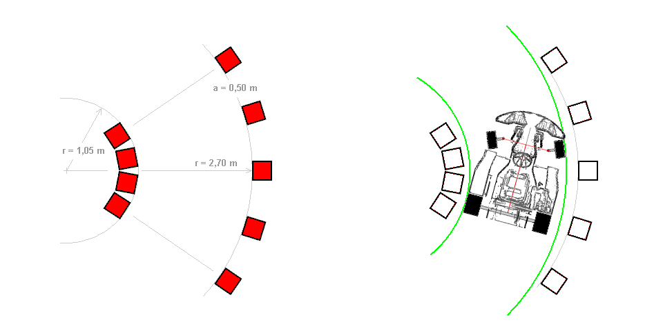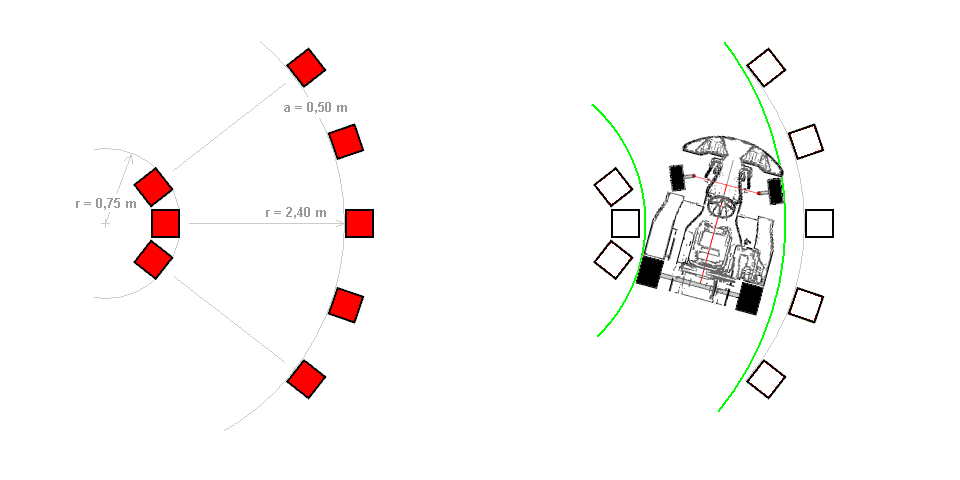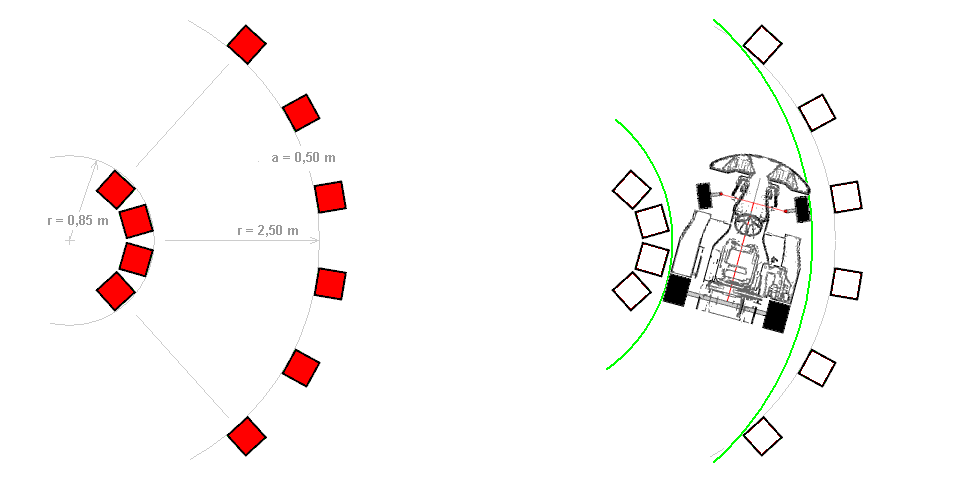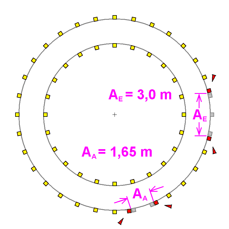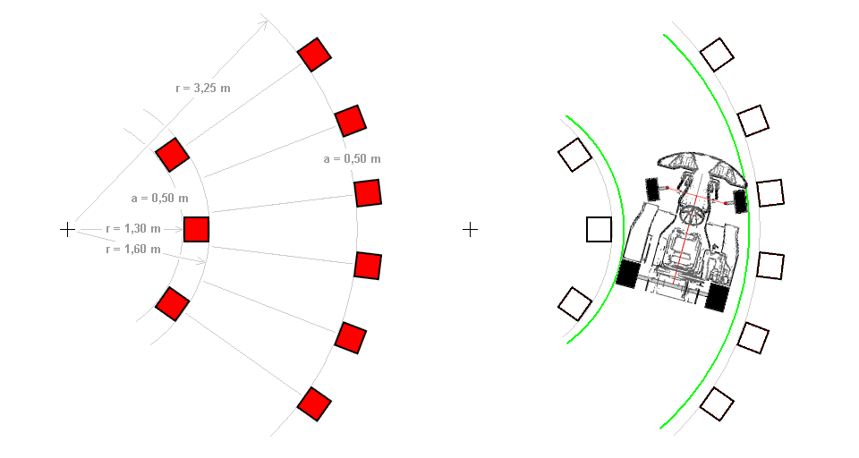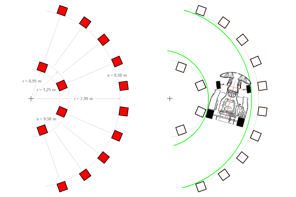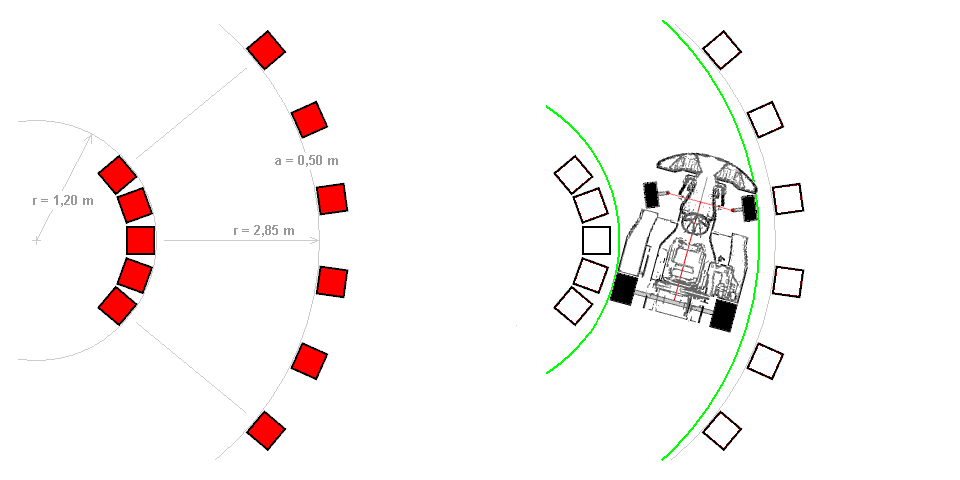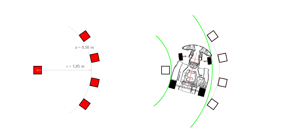 Die Pylonen werden im Abstand von 0,5 m aufgestellt. Dies entspricht auf dem Innenkreis einem Winkel von 23,5° und auf dem Außenkreis von 11,75°.