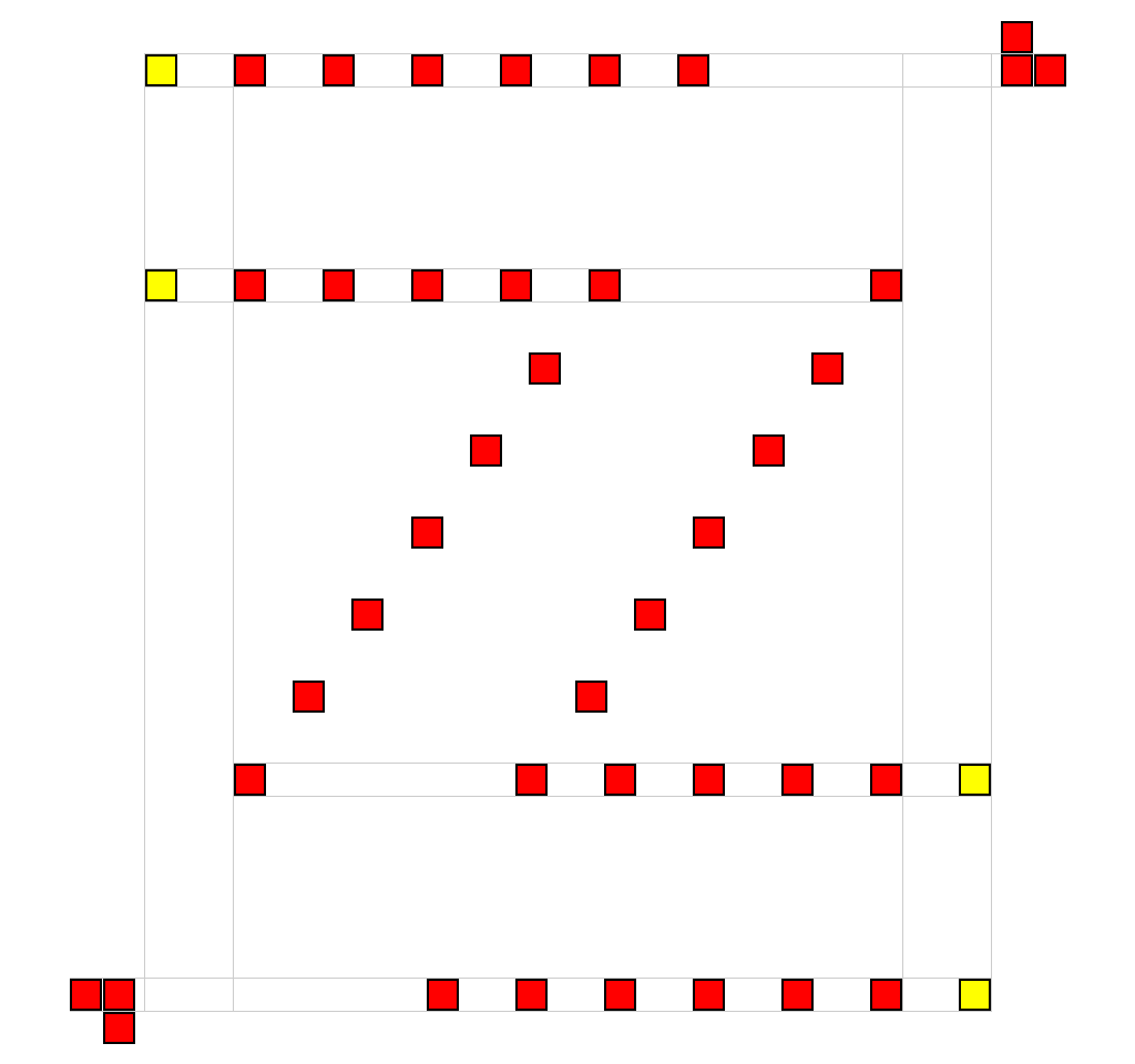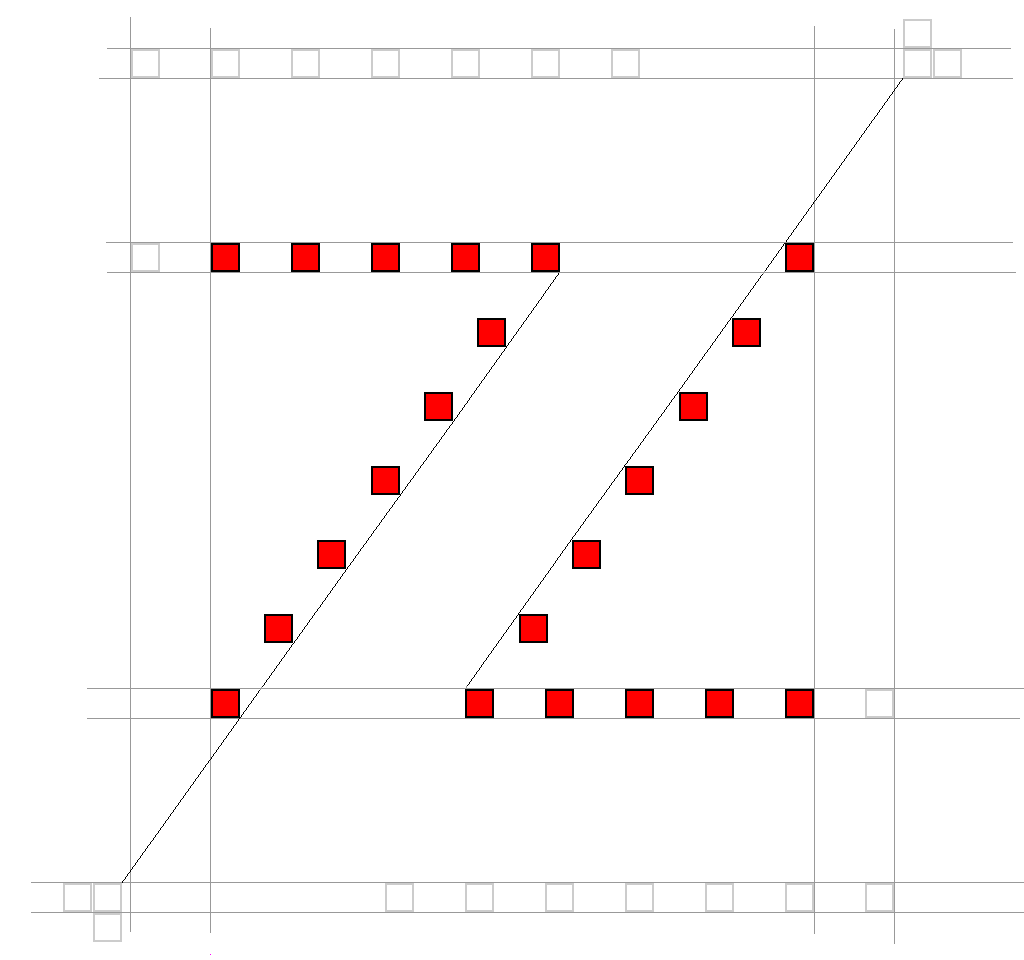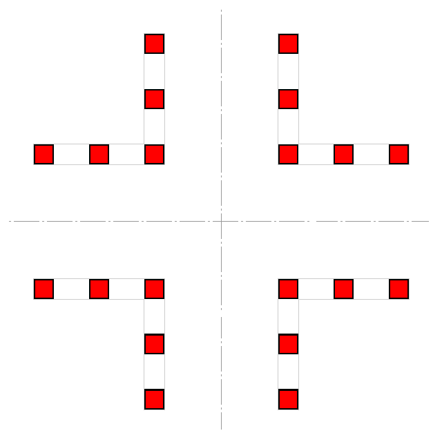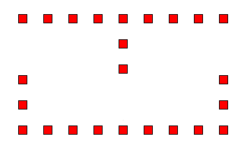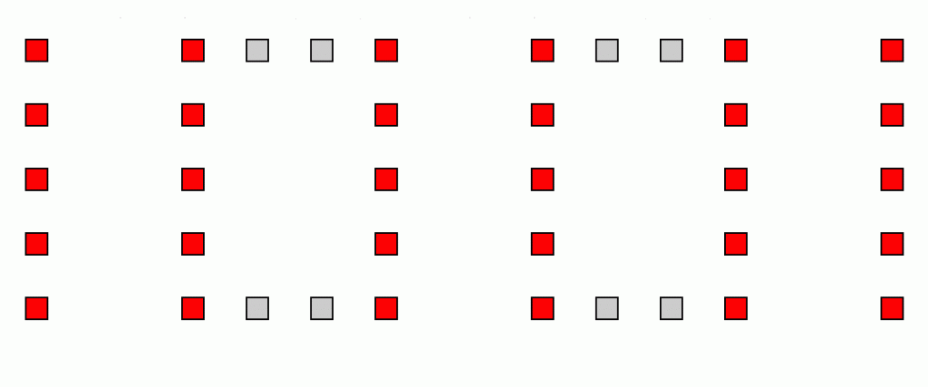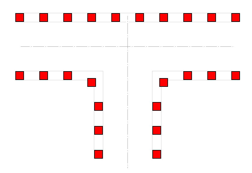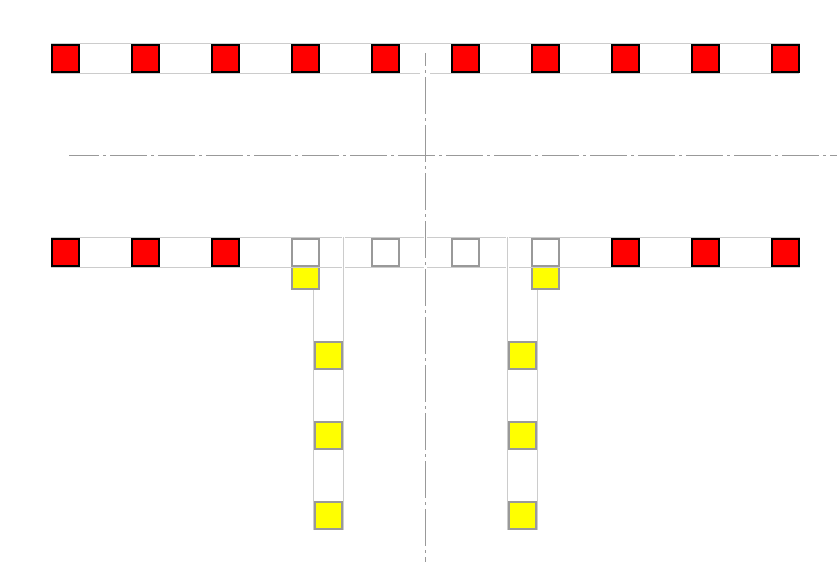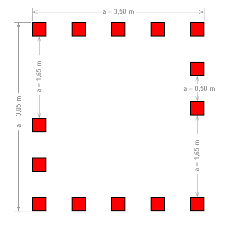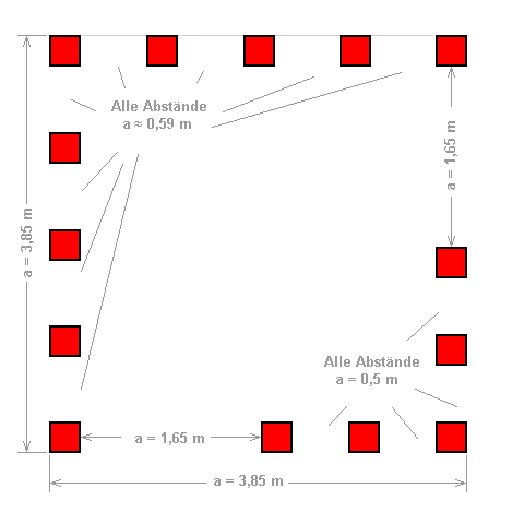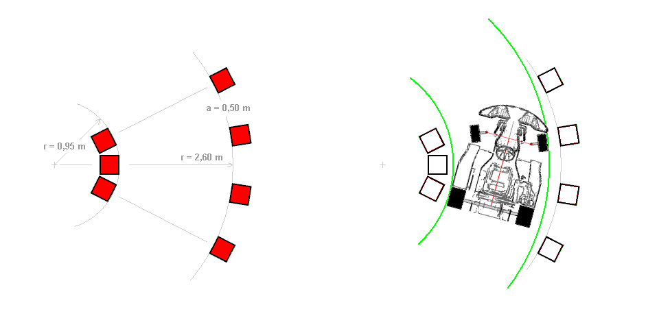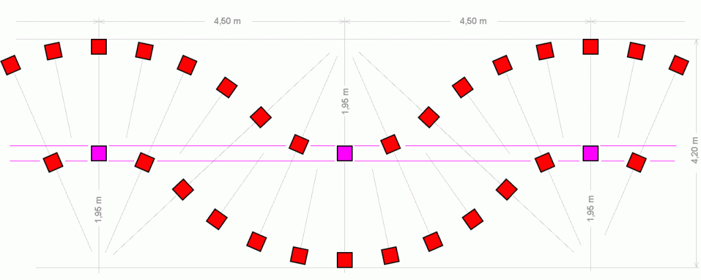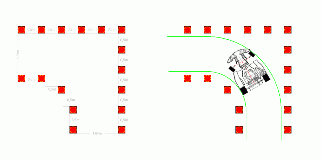Wählt man den Aufbau ähnlich dem „Deutschen Eck“, so passen die Pylonen auf den beiden langen geschlossenen Seiten nicht in das Raster von 0,80 m. Die Ein- und Ausfahrt sind mit dem Maß 1,65 m vorgegeben. Daher müssen die Pylonen auf den Außenseiten mit einem Fußabstand von etwa 0,59 m aufgestellt werden.