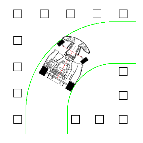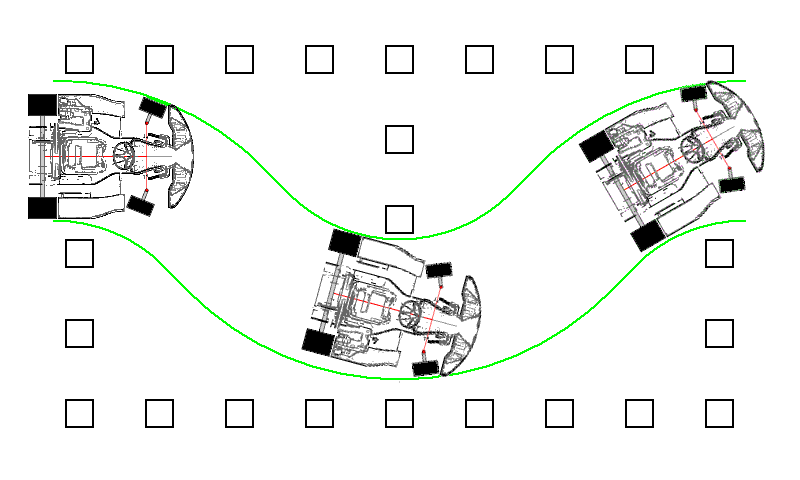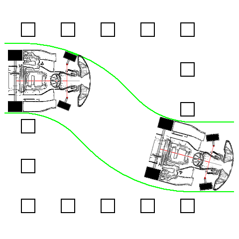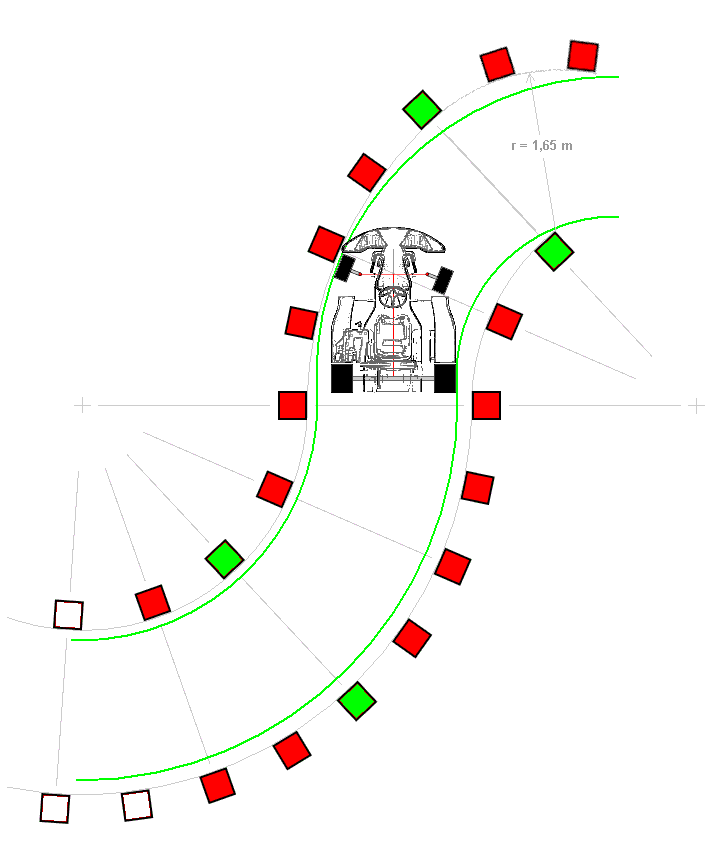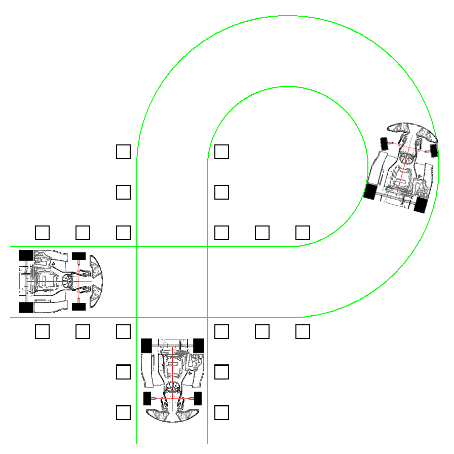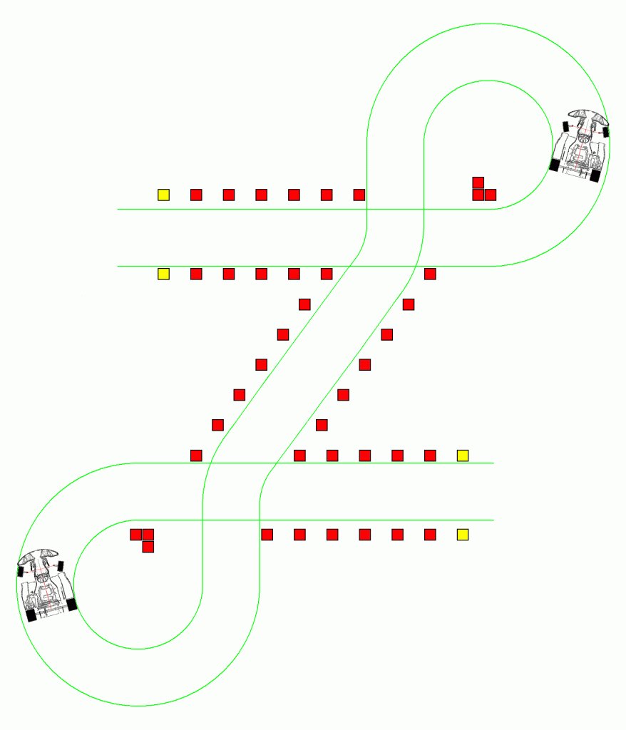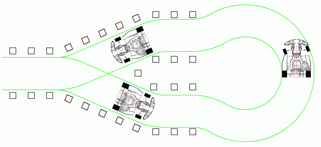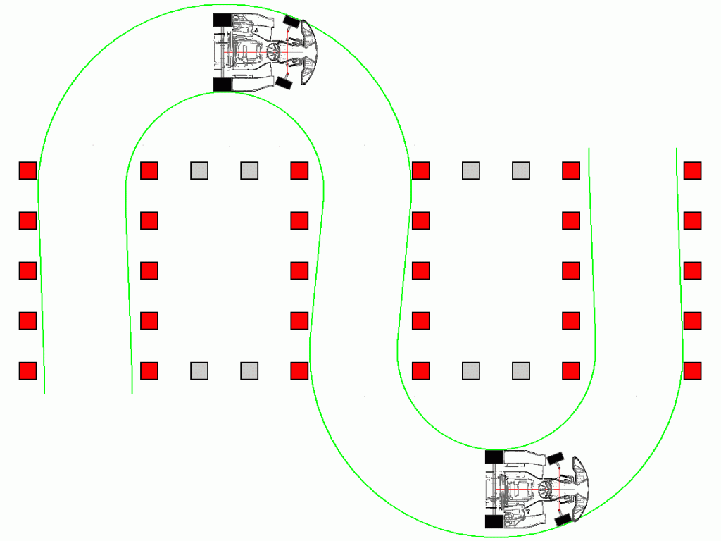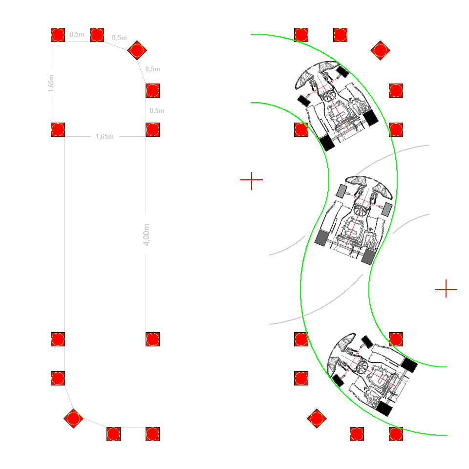Die Z-Gasse besteht aus einer parallelen Anordnung dreier geraden Gassen. Auf diese Weise wird auch der maximale Radius (3,0 m), den das Kart bewältigen kann nicht überschritten.