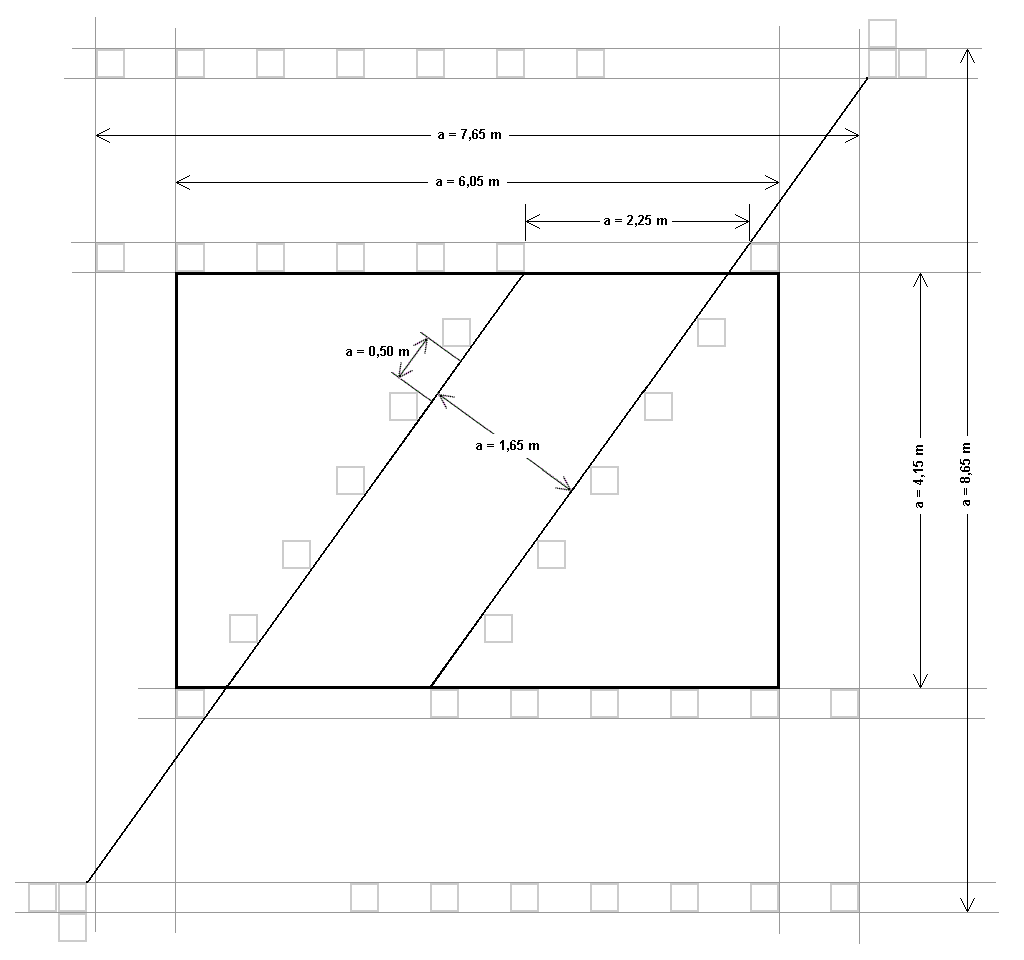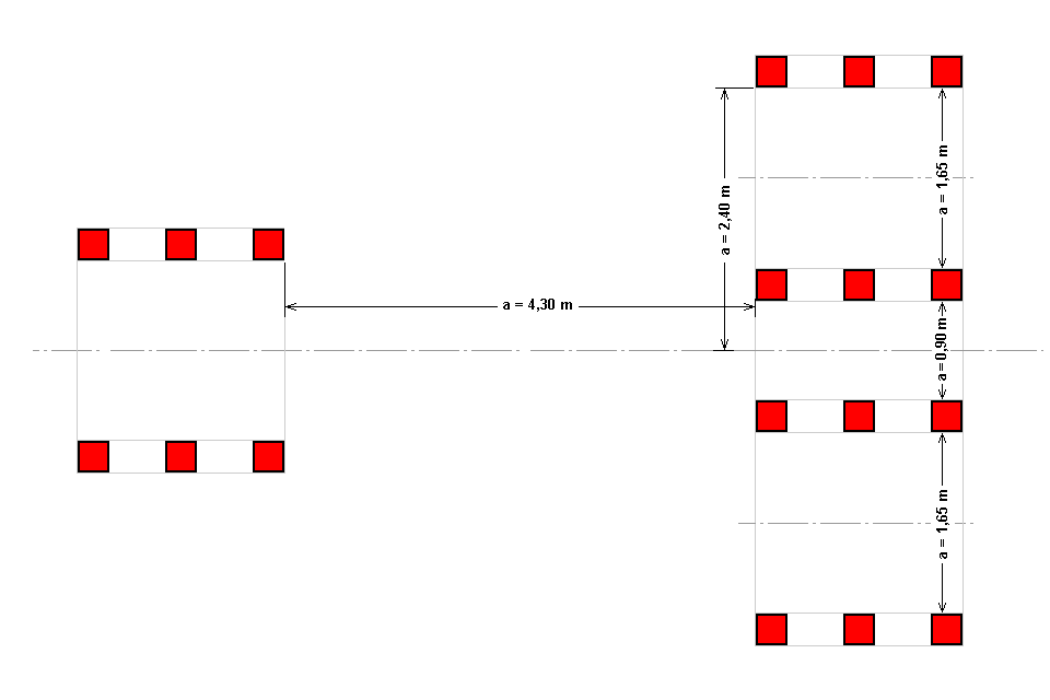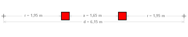 Der Fußabstand zwischen den Reihen beträgt 3,25 m (1 * 1,65 + 2 * 0,5 m + 2 * 0,3 m).