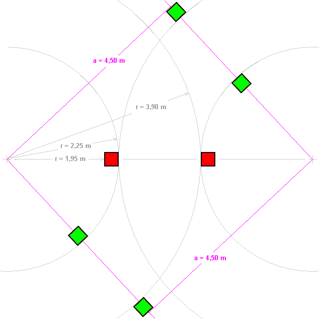 Zur Ergänzung können auch die Mittelpunkte der End-Pylonen einer symmetrischen 7er-Gasse ermittelt werden. Diese sind 4,50 m von den Kreismittelpunkten entfernt.