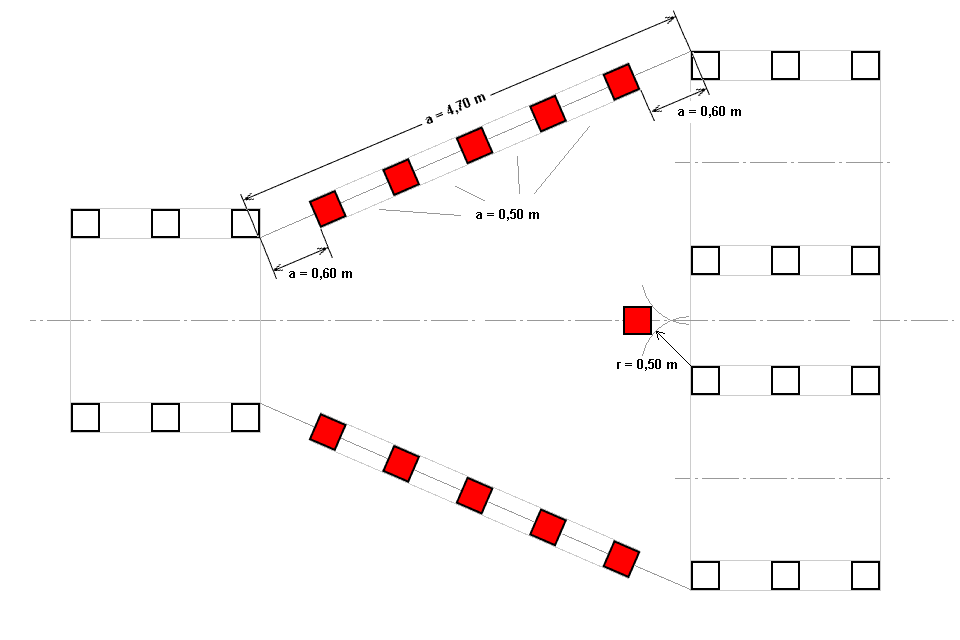 Es werden zwei Reihen von jeweils neun Pylonen aufgestellt. Der Fußabstand zwischen den Pylonen beträgt 0,50 m, somit hat jede Reihe die Länge von 6,70 m (8 * 0,5 m + 9 * 0,30 m).