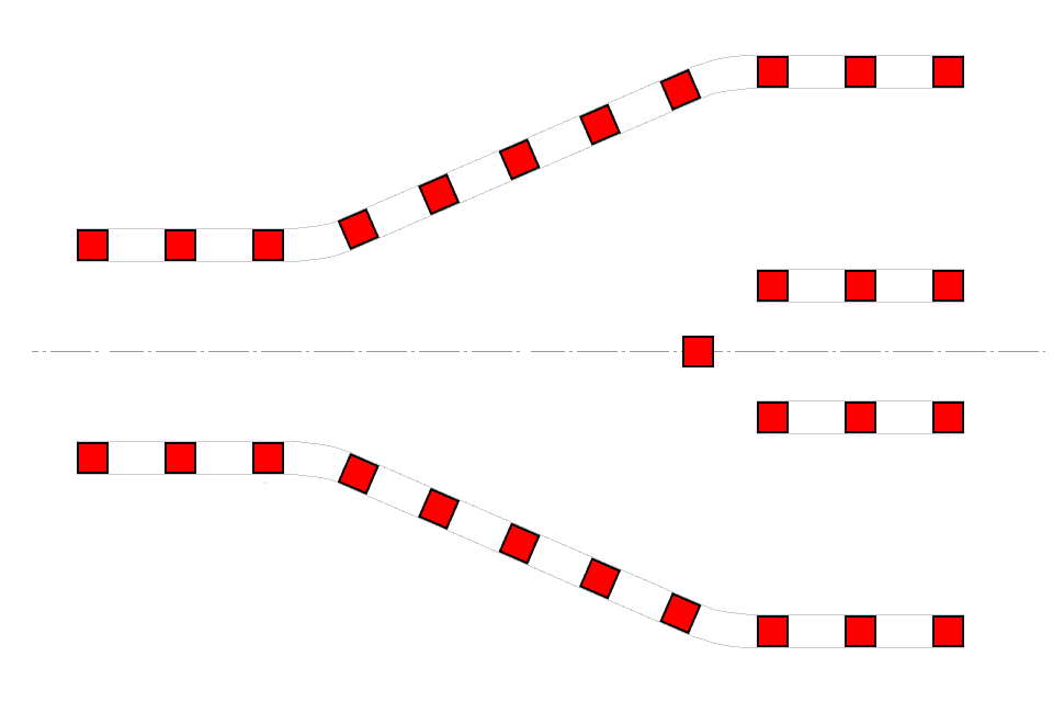 Aus einer gebogenen Spurgasse (Bogen) kann durch Erweiterung eine S-Gasse mit Richtungswechsel aufgebaut werden.