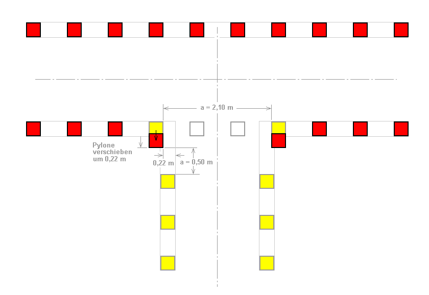 Von der Mitte der Seitengasse aus gesehen stehen die Pylonen somit im Abstand von 1,05 m. Die beiden im Winkel zur Hauptgasse werden so zur Seite geschoben (ca. 0,22 m), dass zur Mittellinie der Hauptgasse auch ein Abstand von 1,05 entsteht.