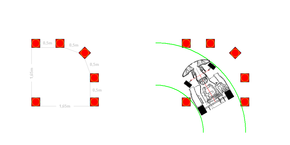 Außerdem ist es möglich, die Ein- oder Ausfahrt mit einem anderen (engeren) Radius zu gestalten, um den Schwierigkeitsgrad zu erhöhen. Hierfür wird einfach an der Ecke der letzten Innenpylone ein Radius von 1,65 m (Fahrspurbreite) gezeichnet und zwei Pylonen im einem Zwischenraum von je 0,5 m aufgestellt.