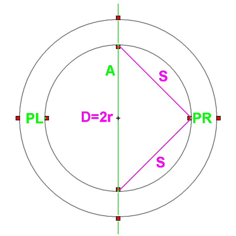 Eine S-Gasse ist besonders einfach aufzubauen, wenn bestimmte Festlegungen getroffen werden. Ideal ist, wenn in einem Winkelbereich auf der Außenlinie doppelt so viele Pylonen stehen wie auf der Innenseite. Durch die vorgegebene Fahrspurbreite von 1,65 m zuzüglich 0,30 m für eine Pylone steht die Differenz beider Radien mit 1,95 m fest. Somit muss auch der innere Radius 1,95 m besitzen, damit außen ein doppelt so großer von 3,90 m entsteht.