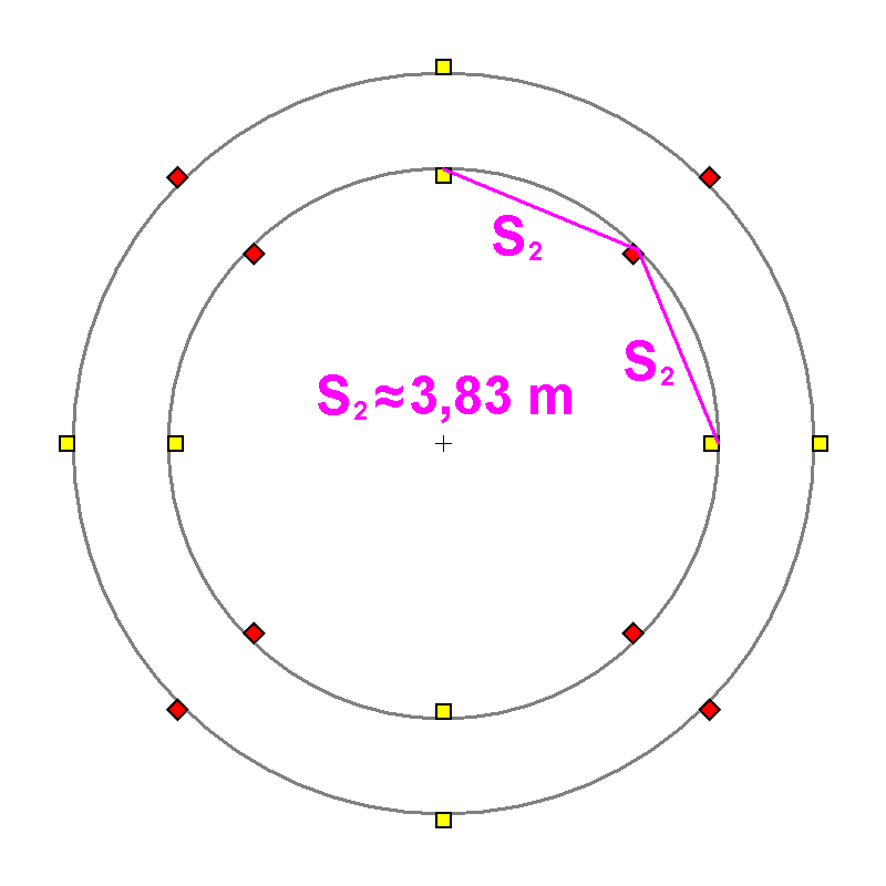Der Abstand S2 vom Mittelpunkt der Pylonenfüße auf dem Innenkreis beträgt etwa 3,83 m