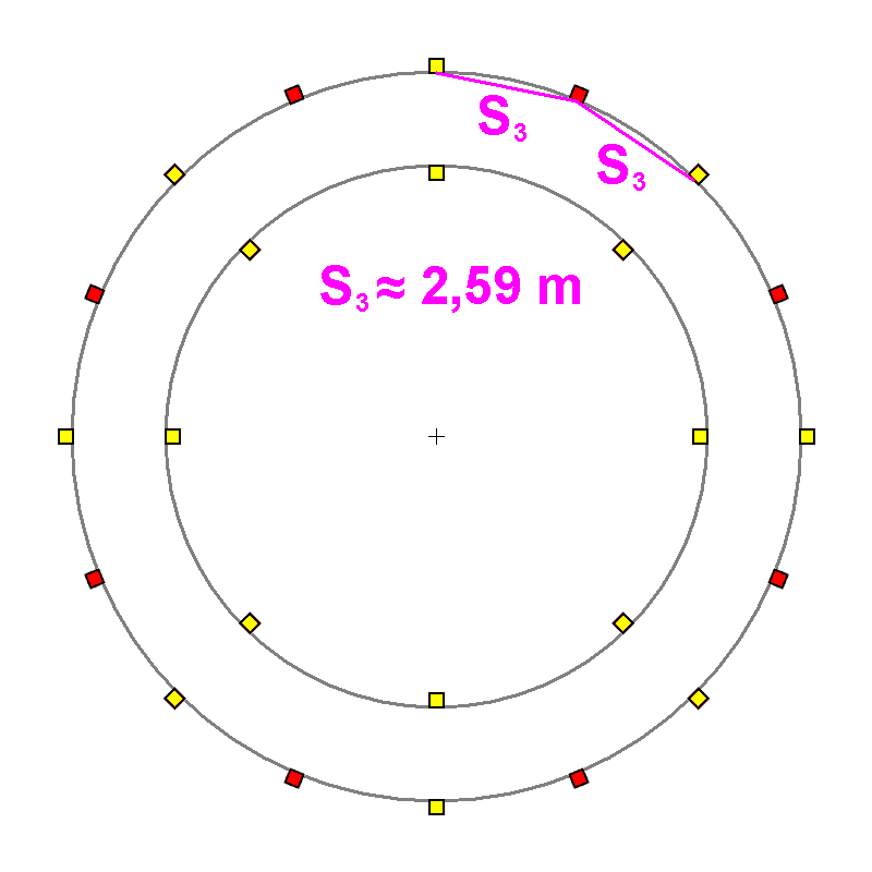Der Abstand S3 vom Mittelpunkt der Pylonenfüße auf dem Außenkreis beträgt etwa 2,59 m