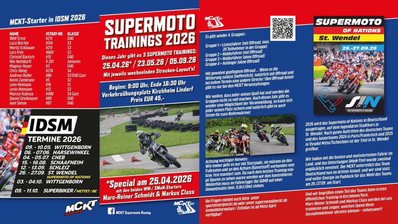 Beim ersten offenen SuperMoto-Training unseres Clubs werden das Clubmitglied und mehrfacher Weltmeister Marc Reiner Schmidt sowie der amtierende deutsche Meister Markus Glass den ganzen Tag über teilnehmen und in einem separaten Zeitslot während der Mittagspause ihr Können eindrucksvoll präsentieren.